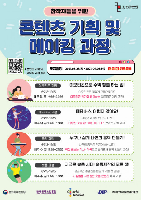 대구시가 주최하고 대구디지털산업진흥원(DIP)이 주관하는 대구콘텐츠코리아랩에서 콘텐츠 분야 창작자들을 위해 ‘2021년 대구콘텐츠코리아랩 콘텐츠 기획 및 메이킹 과정 교육 프로그램’을 운영한다고 밝혔다.